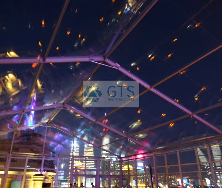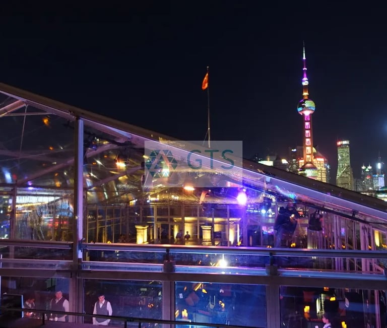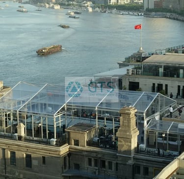 The Engineering Challenge The project required an architectural marvel: a structure that could sit atop the existing roof of the Clearing House. The roof featured a complex, non-standard geometry, making standard marquees impossible to use. Furthermore, the client demanded a 100% transparent design to ensure that the prestigious guests could enjoy an uninterrupted view of the Huangpu River and the Lujiazui skyline during the summit.