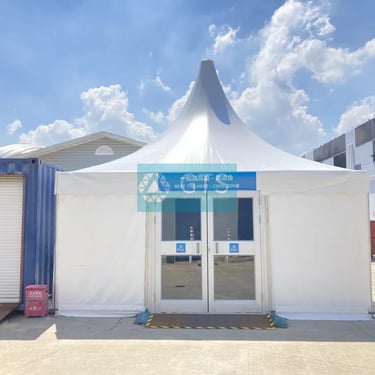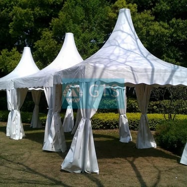 Architecturally distinctive structures with a high, pointed peak, commonly used as entranceways, VIP areas, or small individual event booths.