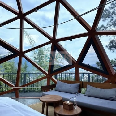 Full-glass panels (Glass Domes). This maximizes natural light and provides guests with an unparalleled 360-degree view of the surrounding landscape, enhancing the immersive nature experience.