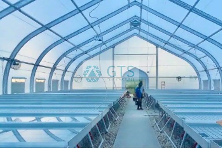 GTS offers limitless customization to meet complex operational needs. We provide various frame spans (up to 60m+) and lengths that can be extended indefinitely. Clients can choose from specialized fabric colors and a wide range of accessories, including industrial doors and advanced ventilation systems.